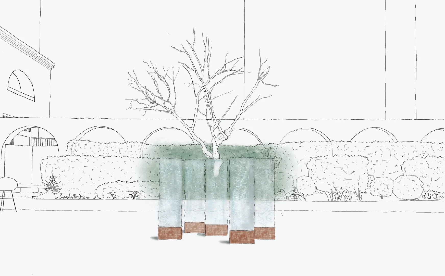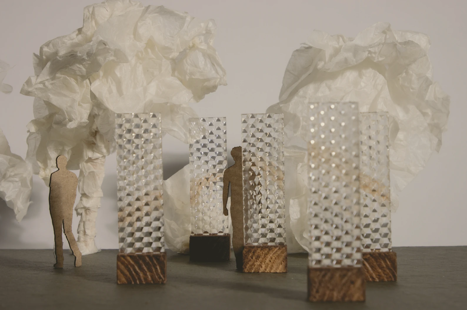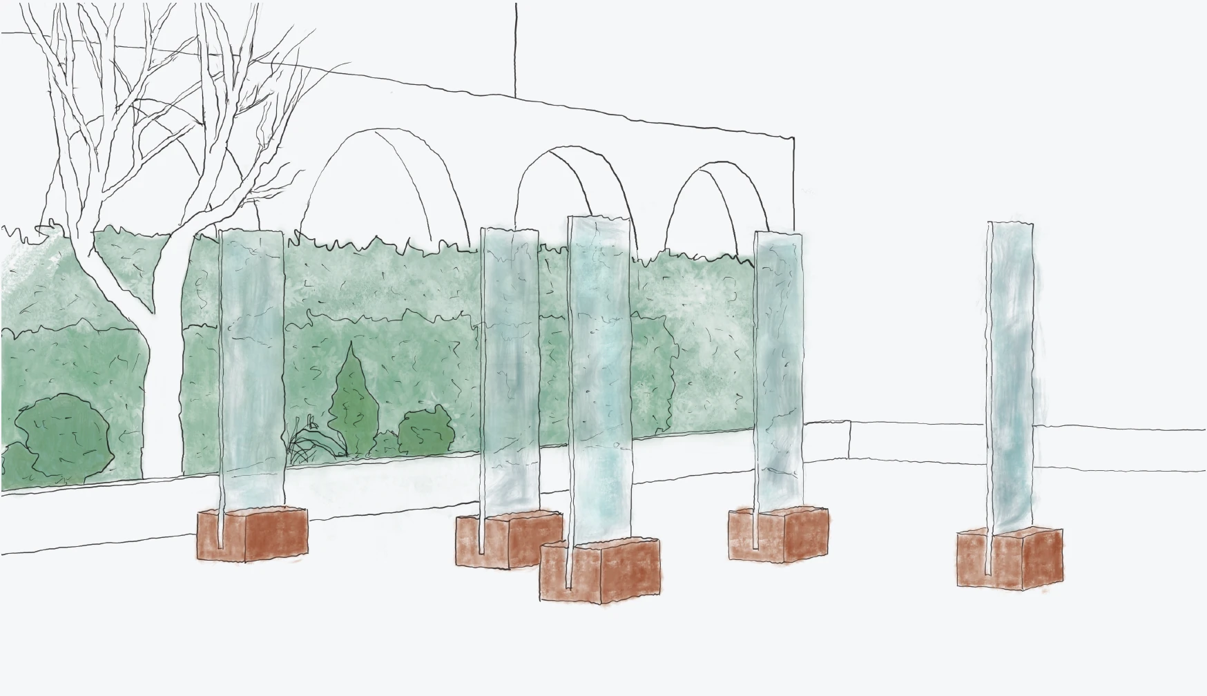 “Anónimo” consta de cinco piezas escultóricas que componen una instalación de arquitectura efímera. Hacemos protagonista al vidrio como material principal de la instalación ya que nos permite reinterpretar la técnica empleada por Cezanne de una manera contemporánea. Incorporamos la verticalidad y horizontalidad de la obra de Cézanne. El desdibujo de la vegetación y la transparencia la obtuvimos a través de diferentes planos de piezas de vidrio texturizado y sutiles toques de color que unificaban la instalación.