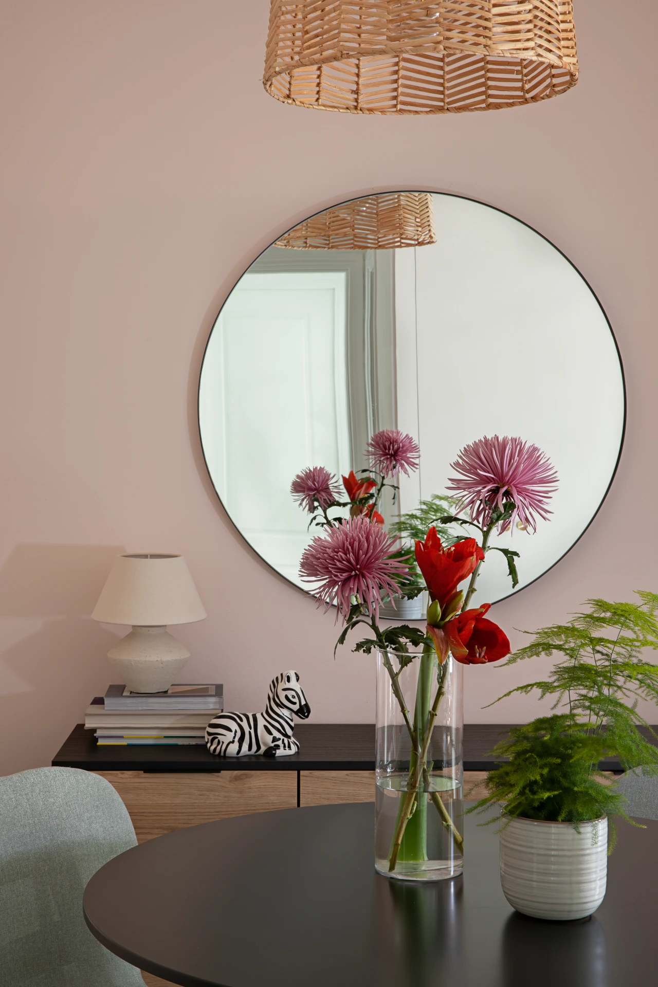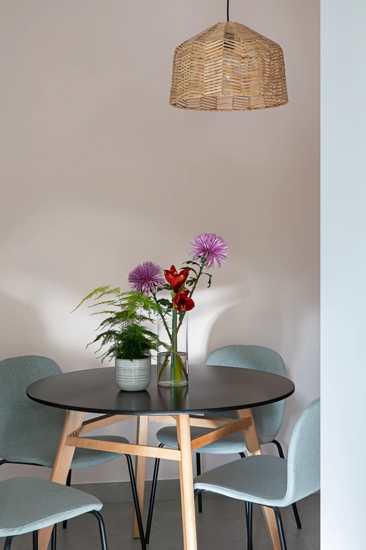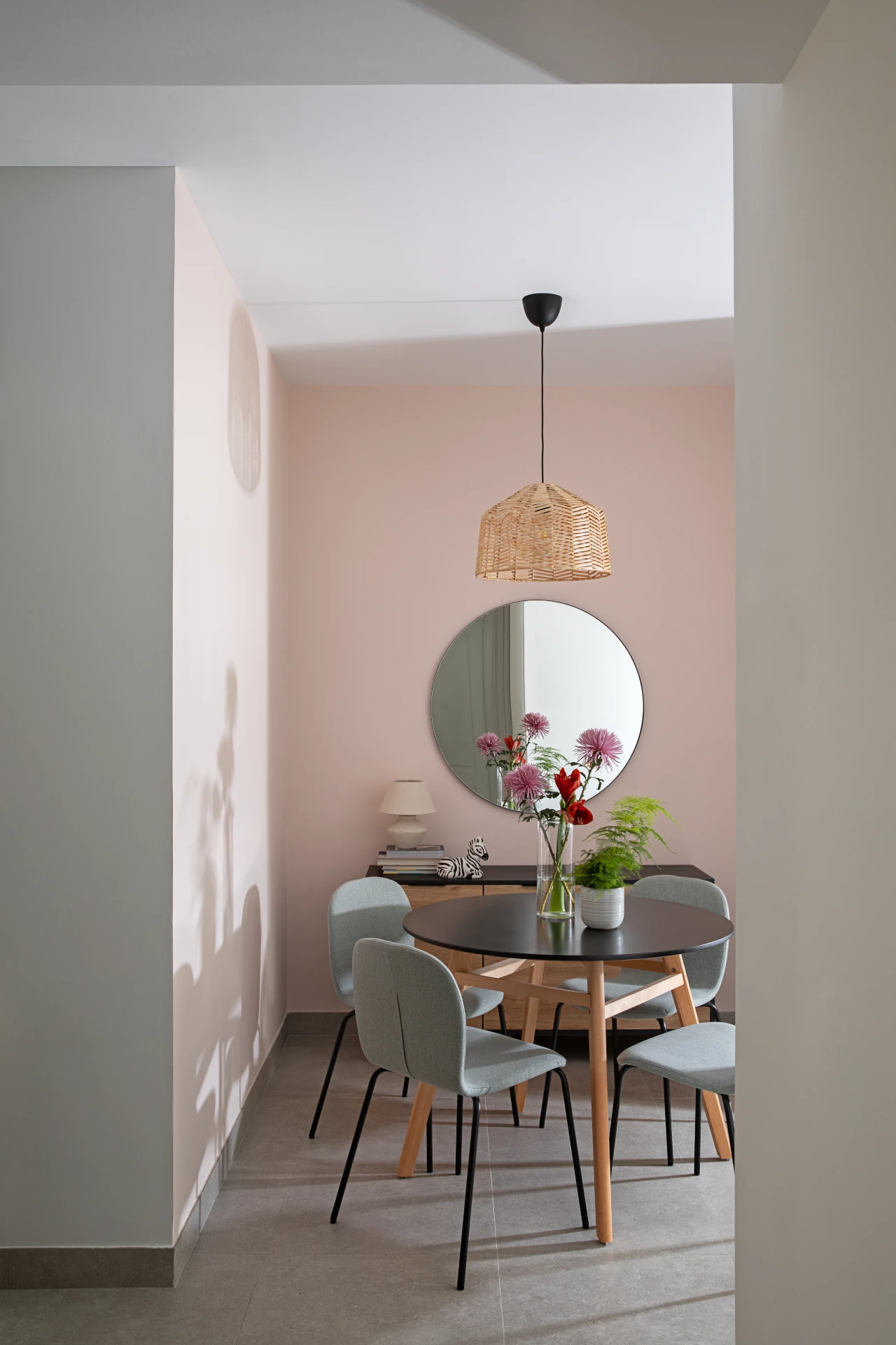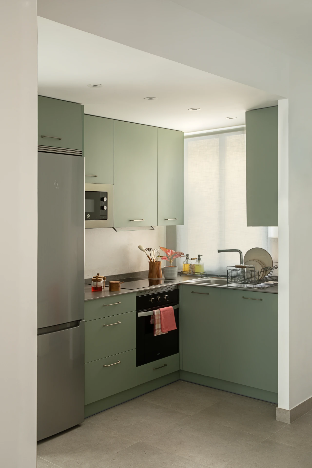 Una propuesta basada en suelos continuos de gran formato, una paleta de colores pastel donde el verde y el rosa son protagonistas y nos ayudaron a huir de la monotonía y a su vez contrastaban con superficies o detalles negros como los de las luminarias. Otra apuesta para ayudar a la sensación de amplitud del espacio fue la apertura de la cocina al salón y el juego de alturas que realizamos con los techos de las zonas de paso y las diferentes utilidades de cocina y salón, algo que… volvió a jugar a nuestro favor en eso de “huir de lo aburrido” ya que dotaba al espacio de dinamismo.