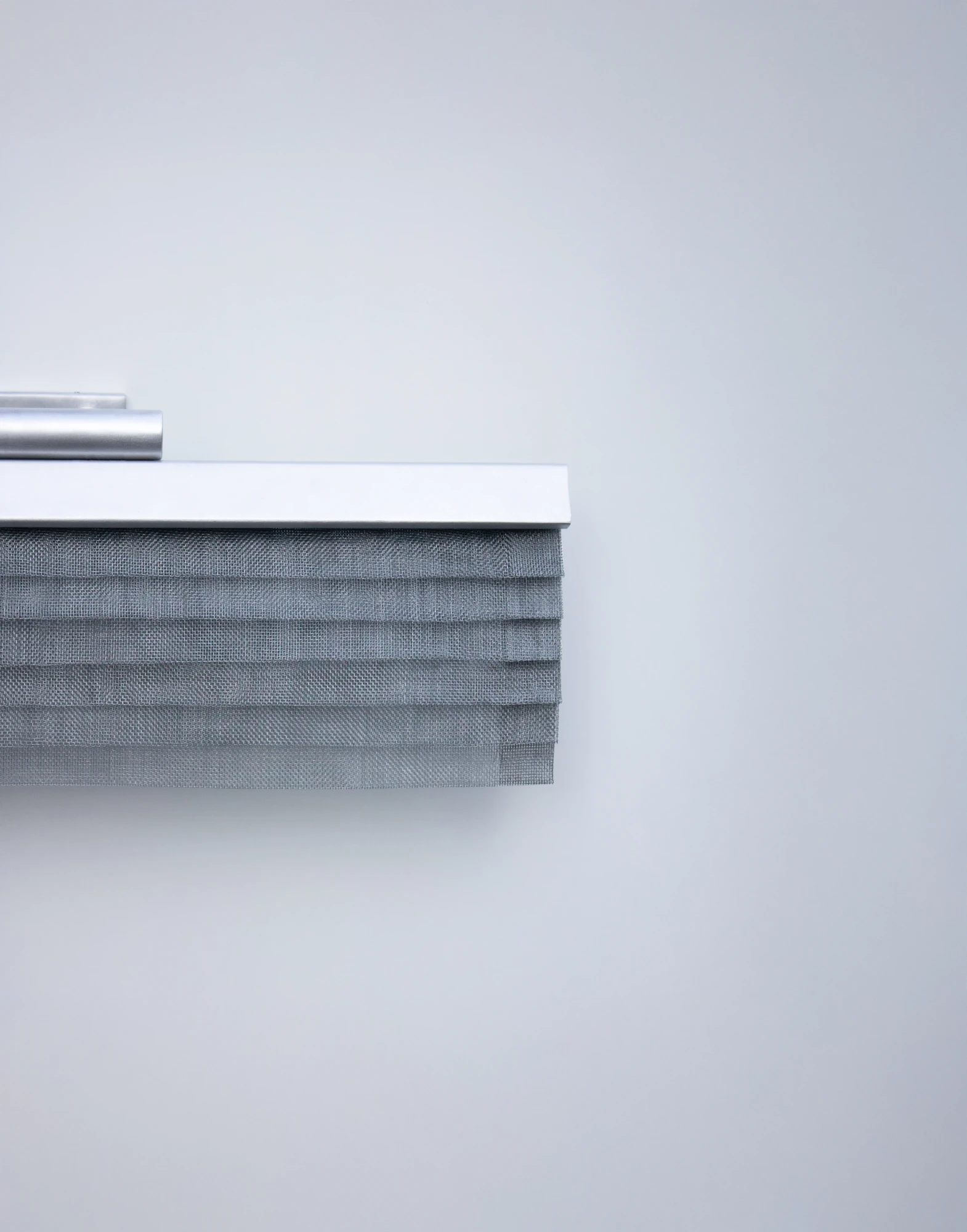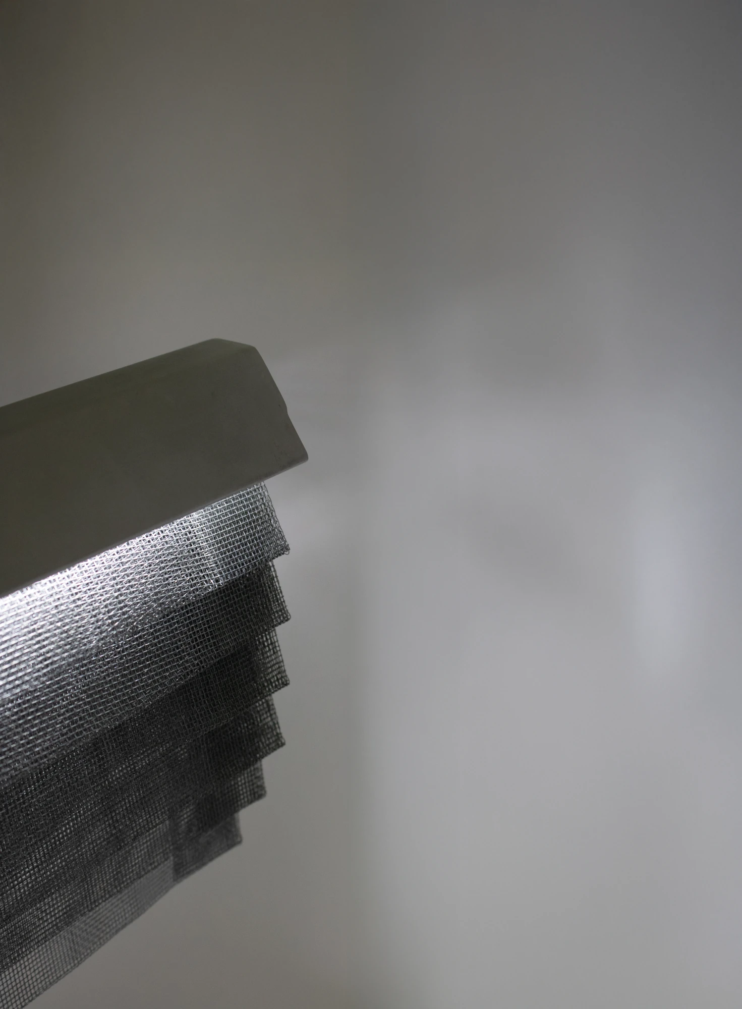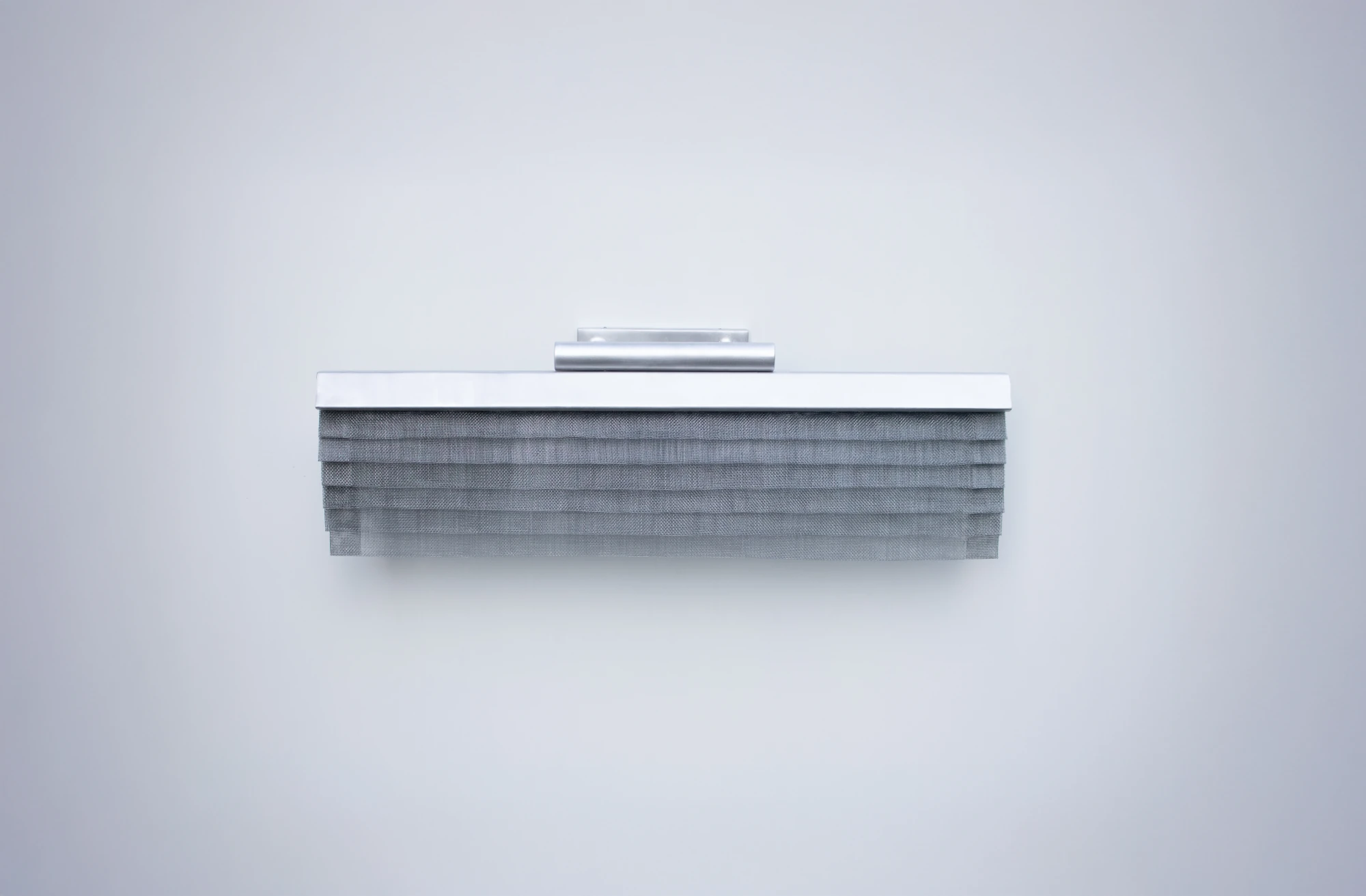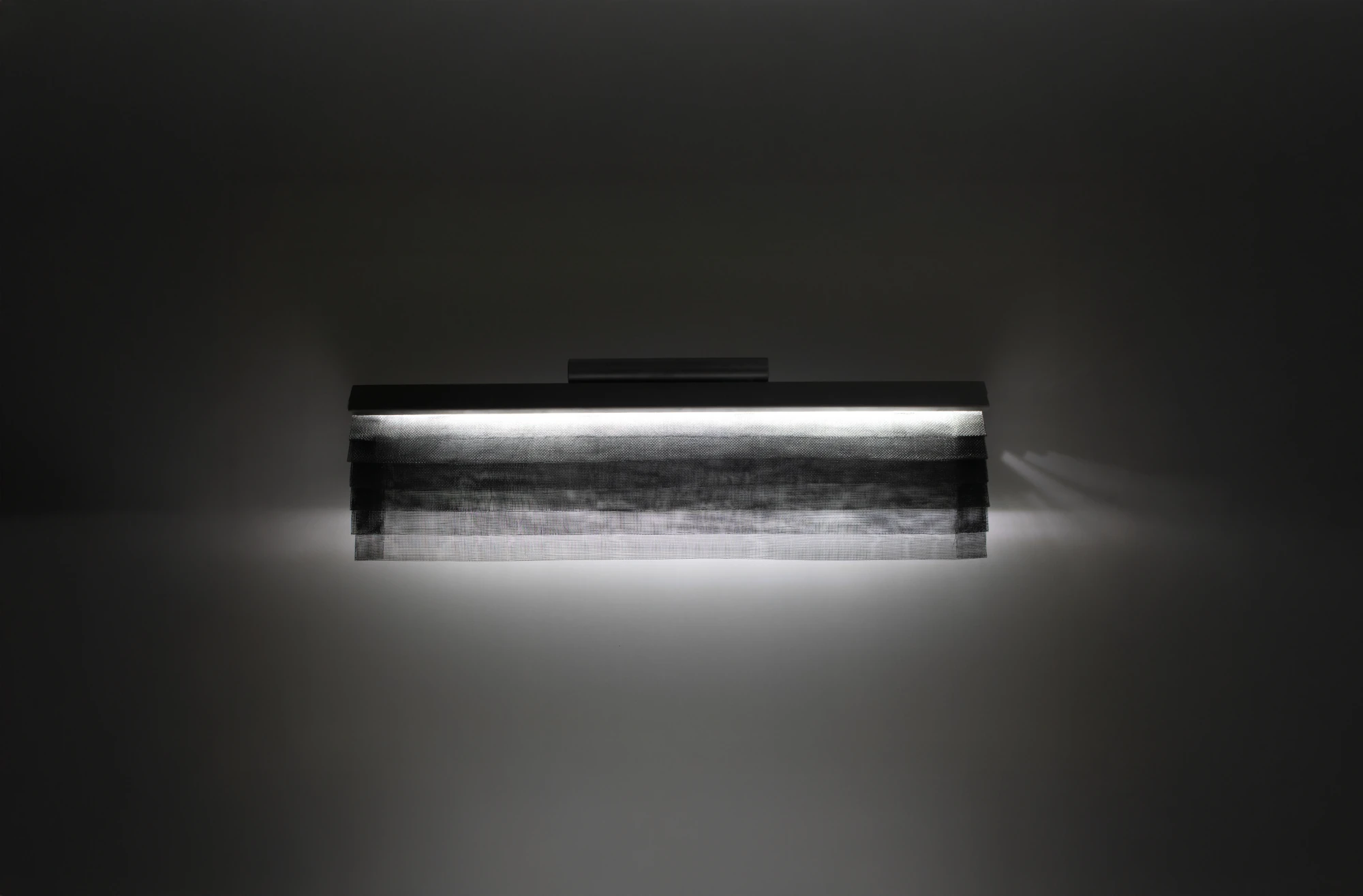 DOBLEZ es el dominio del material a través del orden y la organización de la tela metálica. La luz proyectada sobre la superposición de dobleces del tejido genera un sutil gradiente de grises protagonistas de este aplique de pared multidireccional.